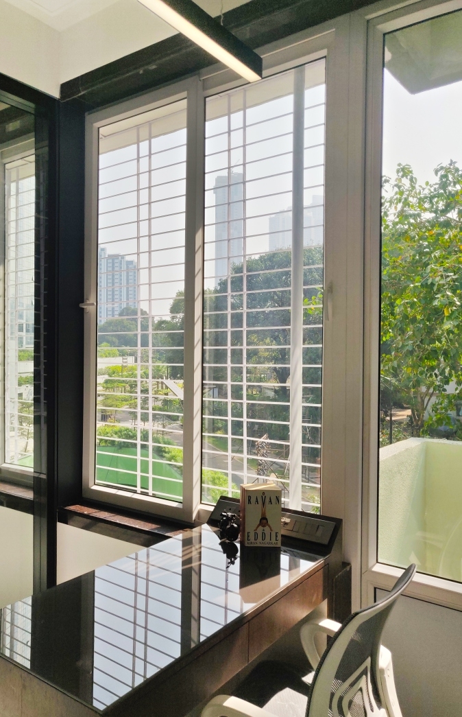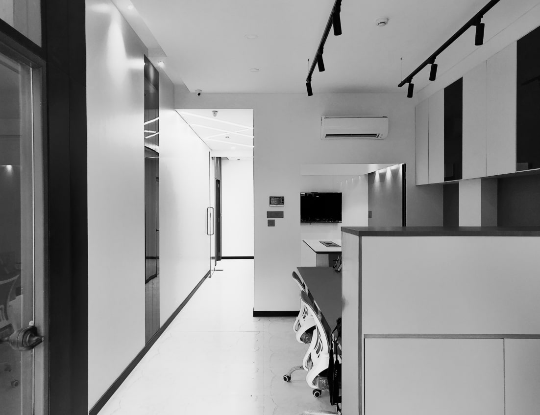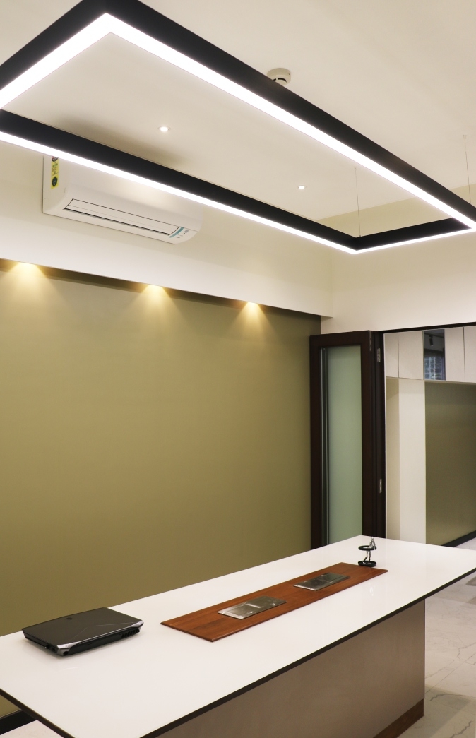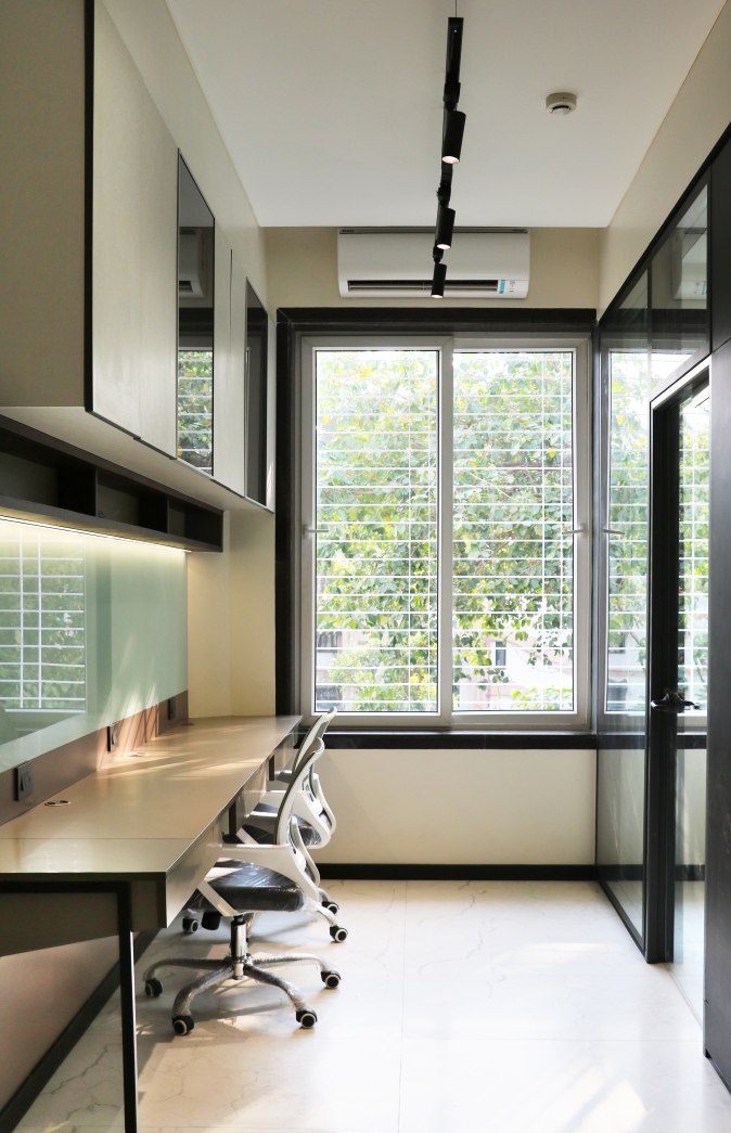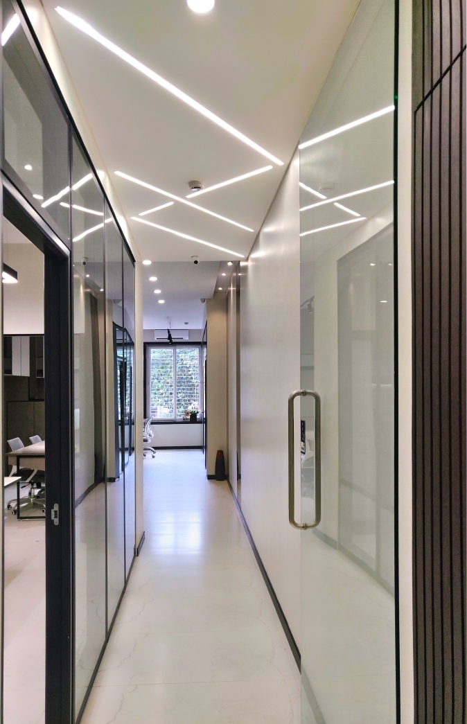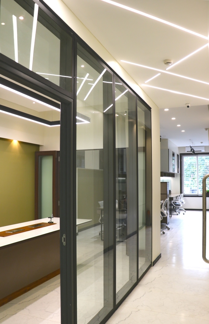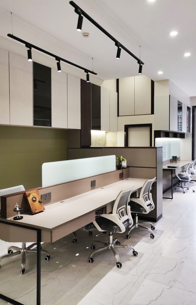 The cabins and partitions are made of double-glazed, soundproof glass, ensuring privacy and reducing noise. The design palette consists of neutral tones like olive, beige, and white, creating a calm and professional environment.